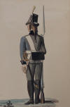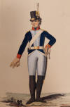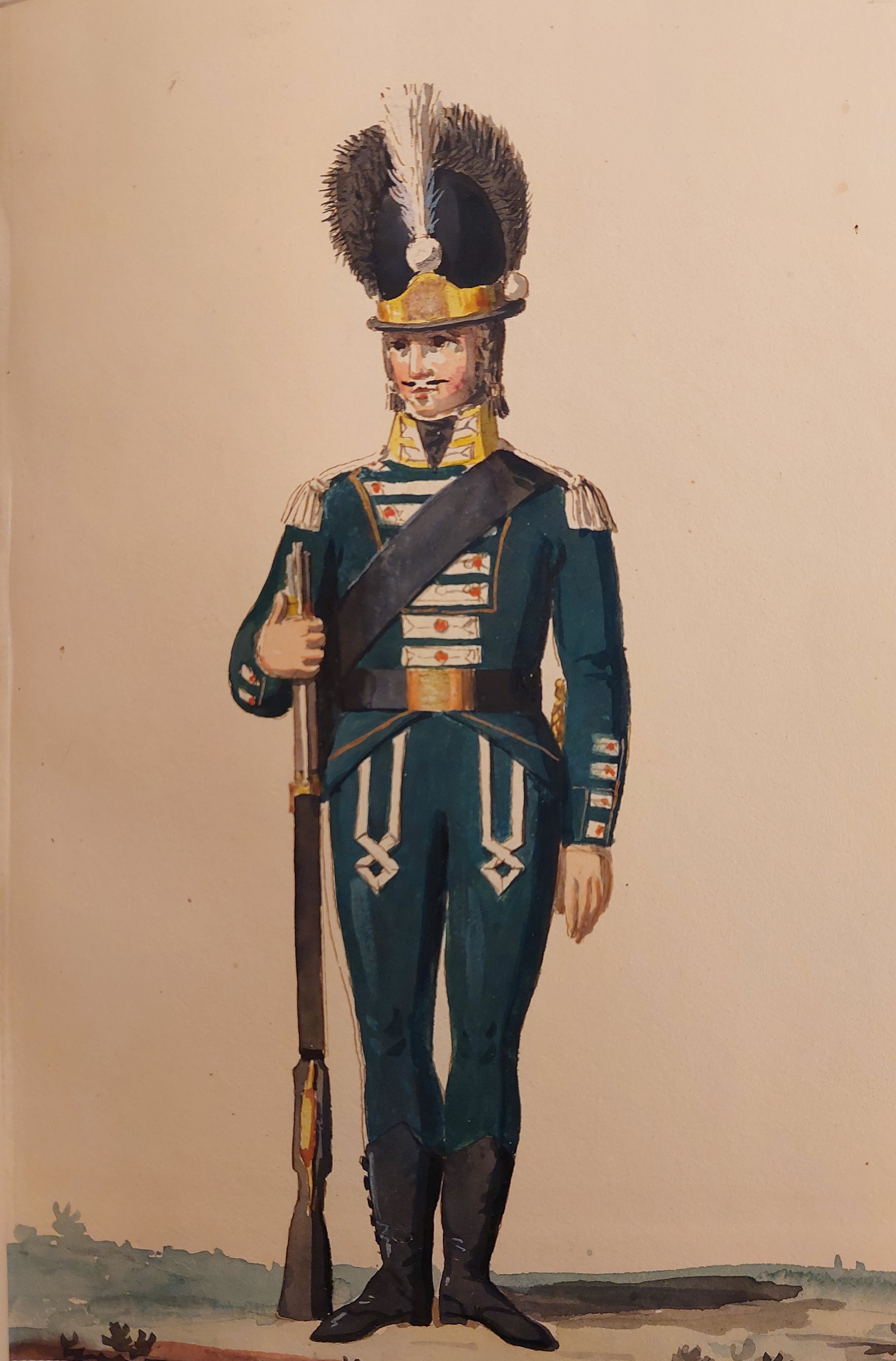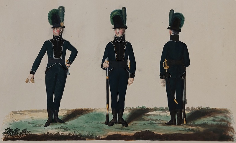 Jägarbataljonen utmärker sig med gröna hattplymer i Gillbergs senare plansch