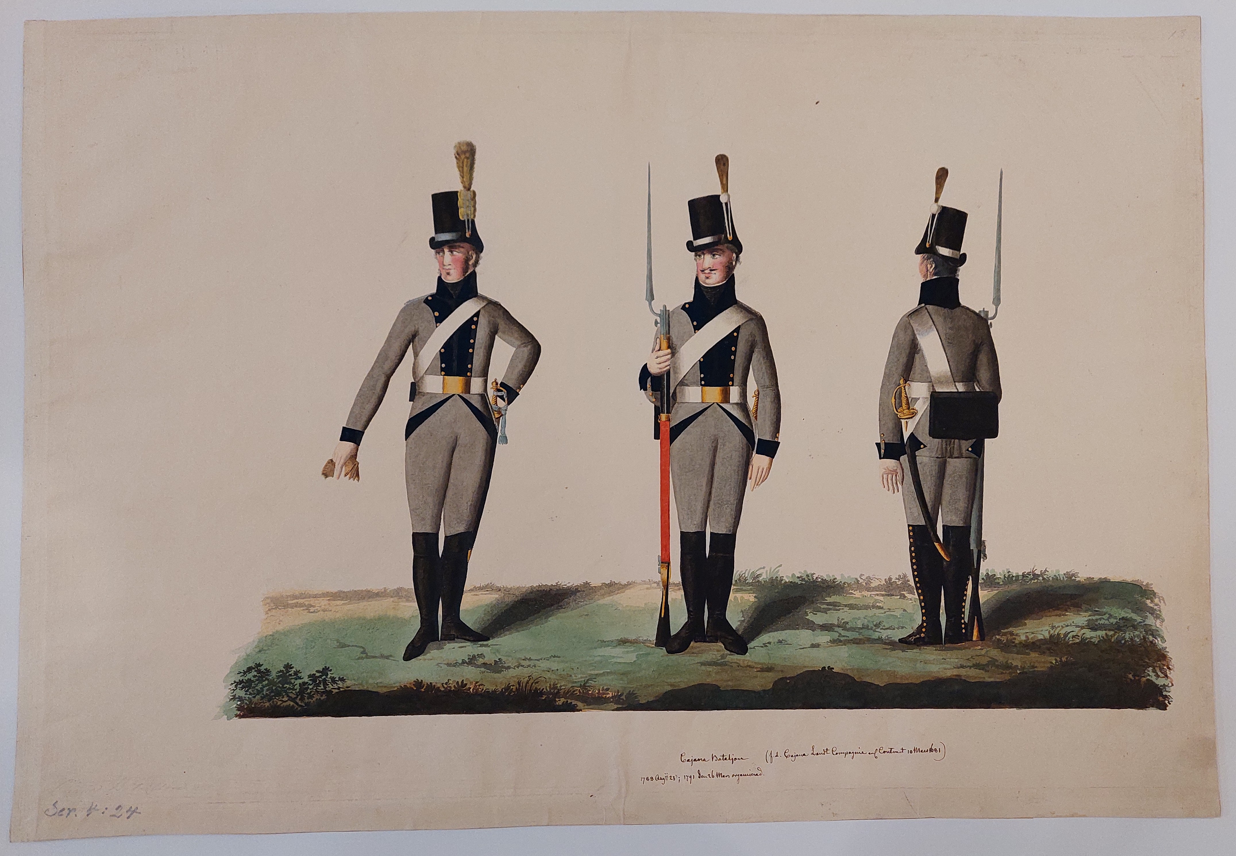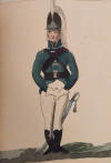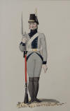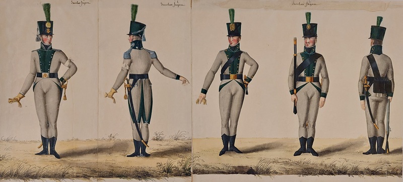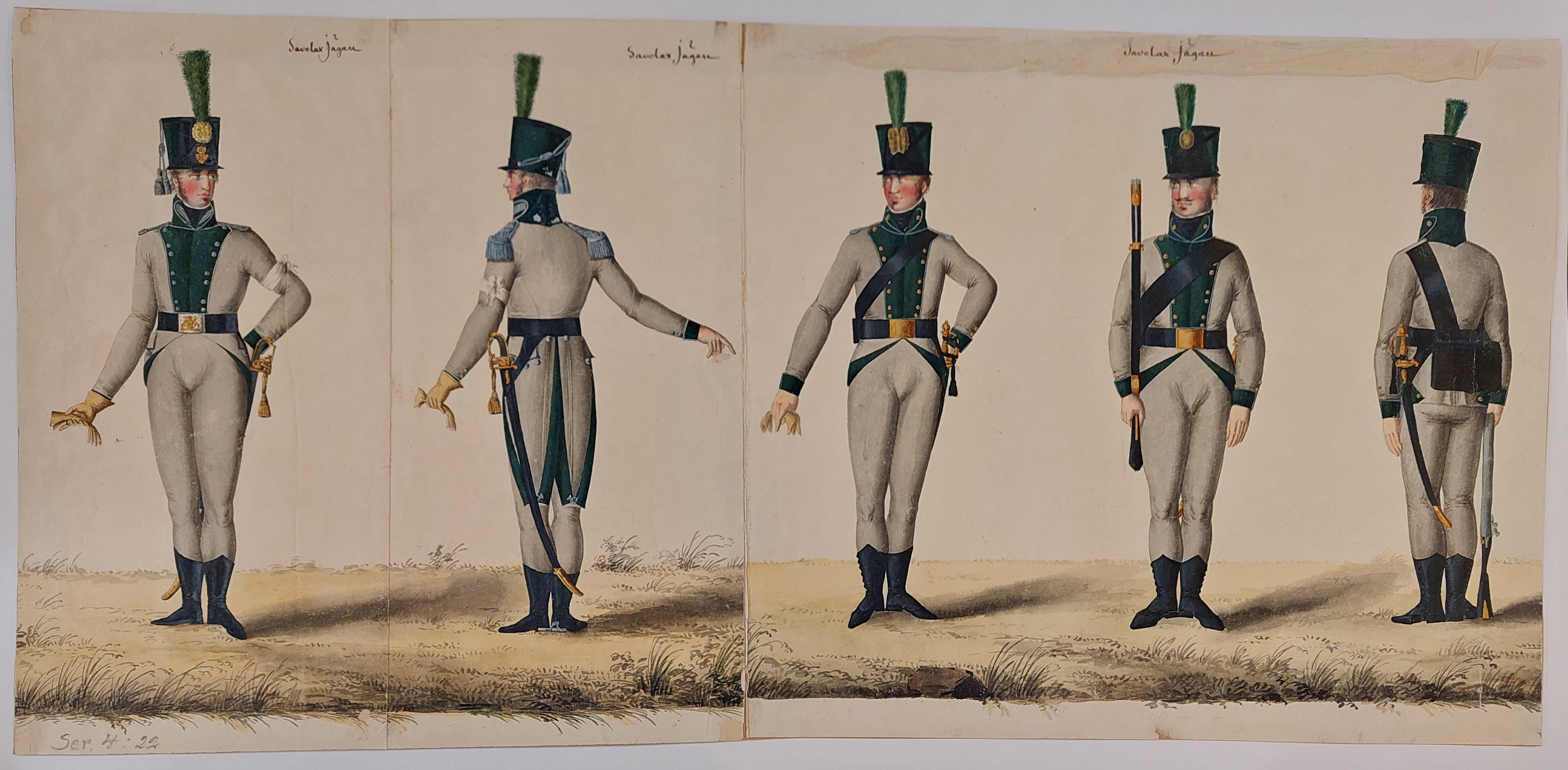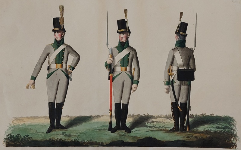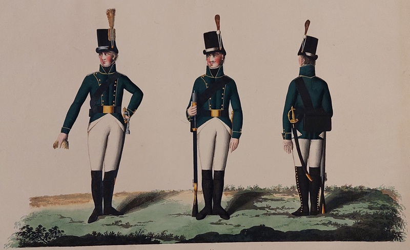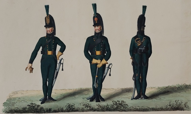Jägarbataljonen utmärker sig med gröna hattplymer i Gillbergs senare plansch