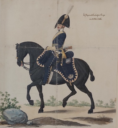 Axelgehänget och det blågula skärpet från m/1792 som ersattes av livgehäng i